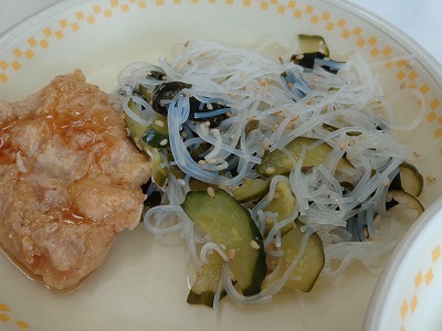 春雨ときゅうり、わかめの酢の物は胡麻が入っています。わかりづらいですが、しらすも混ぜてあるので、カルシウムもとれる酢の物になりました。