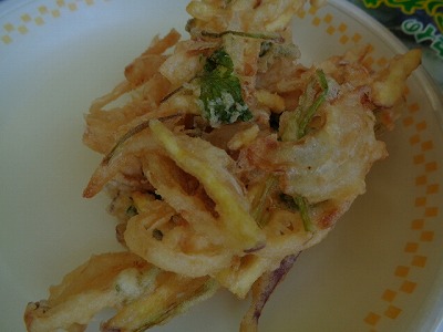 かき揚げの玉ねぎは「新たまねぎ」使っています。普段使っている玉ねぎより、真っ白でみずみずしさのある玉ねぎです。さつまいもと三つ葉、竹輪が混ざって、野菜のあまさを感じるようなかき揚げでした。
