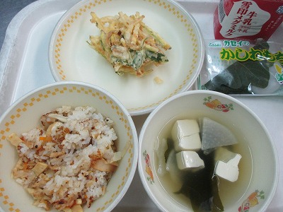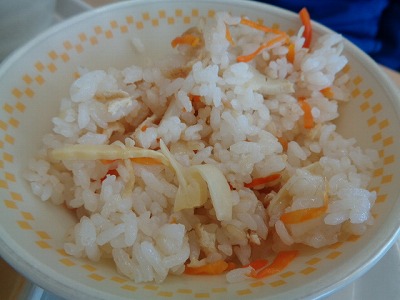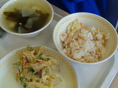 筍、人参、油揚げの入った炊き込みごはんは、出汁の味が効いたごはんになりました。たけのこは、竹のようにまっすぐ元気に育ってほしいという願いをこめて食べられる食材です。