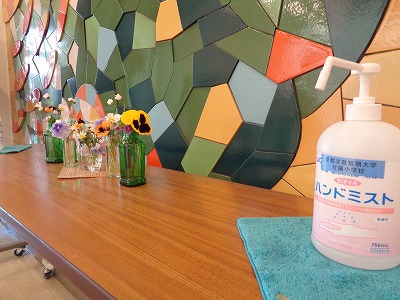 こちらは玄関。アルコール消毒を置いているテーブルです。