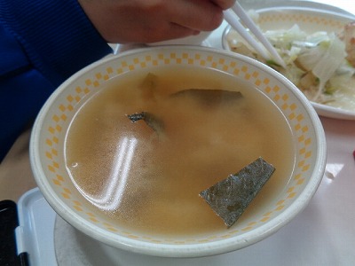 お味噌汁の小松菜は、食感がほどよく残るように加熱します。緑黄色野菜であり、カルシウムの栄養素も多く含んだ野菜です。油揚げ、玉ねぎと合わせて調理しました。