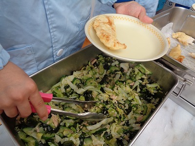 人参や玉ねぎはニラの形に合わせて、短冊切り、うす切りにしました。献立に使う材料の切り方はメニューによって、見た目や食感が合うように工夫されています。