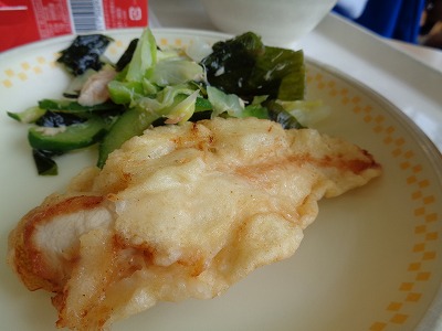 ささみに塩こしょうで下味をつけて、とり天にしました。とり天はもともと大分県の郷土料理として知られています。外はカリッと中はお肉がふんわりに仕上がりました。