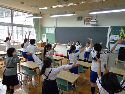 なんとお手本の先生は、お姉さん・お兄さん達です。突然のお願いでしたが、快く引き受け、ダンサー顔負けの見事なパフォーマンスでしっかり歌ってくれたのでした! 前に出た1年生も、それにつられて体が動きます。