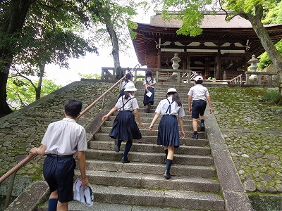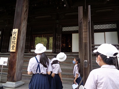 次に、阿弥陀堂に行きました。こちらには金色の大きな阿弥陀様がおられます。子ども達は興味津々です。それは教室の阿弥陀様(写真)と同じだからです。感慨深く見ていました。