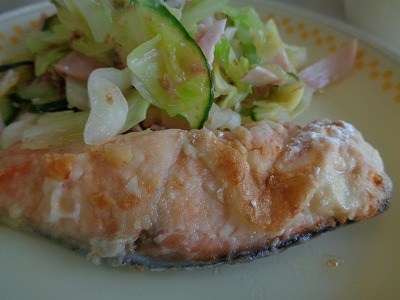 鮭は、塩こしょうで下味をつけておきます。朝一番にその作業をして、短い時間でも、よく味がつくようにしています。溶かしたバターを全体にかけて、焼き上げると外側がカリッとして、バター風味もしっかり残ります。