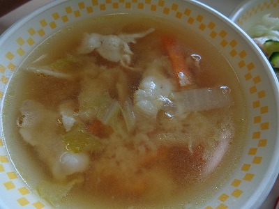白菜の味噌汁は、豚肉といっしょに煮込んで調理しました。白菜の白いしんの部分は、みんなが食べやすいように、繊維を断って細い長方形に切るなど工夫しています。