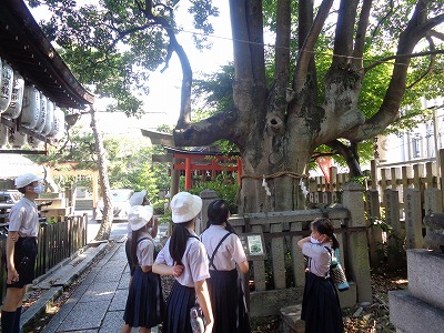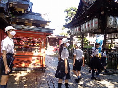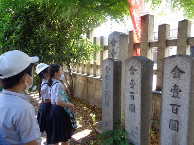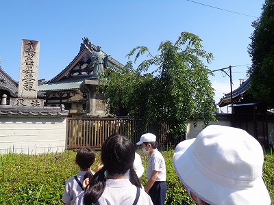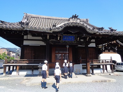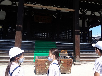 お堂の扁額を一生懸命読み解きました。右から左に読むと「西見延」の文字が分かりました。日蓮宗総本山は山梨県にある見延山久遠寺ですが、この妙傳寺が、ご分骨されている西日本を代表する日蓮宗のお寺なのです。子ども達も目ざとく、賽銭箱の「関西見延」の言葉を発見しました。メンバーがいろいろな方向に目を向けているのが分かります。