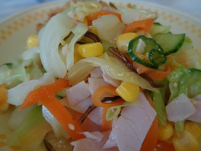 元気サラダは「サラダでげんき」という絵本から考えられました。色とりどりの野菜が入っていて、見た目も鮮やかです。塩昆布やかつお節、ごまの風味が野菜を食べやすくしてくれます。