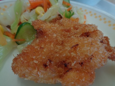カツに使うお肉は鶏胸肉です。塩こしょうで下味をつけて、味をなじませます。パン粉をつけるときは小麦粉、卵、パン粉と順につけていくのが一般的ですが、給食では小麦粉、卵、水を全て混ぜたものにつけてからパン粉をつけています。そうすると工程が少なくなり時短につながり、余分な衣がつきすぎるのを防ぐことも出来ます。