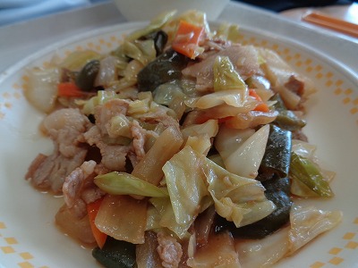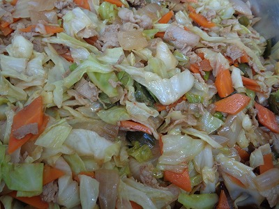 豚バラ肉を合わせた味噌で、しっかり炒めてから蒸した野菜を入れて炒め合わせています。キャベツのシャキシャキした食感が残るように注意しました。