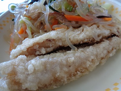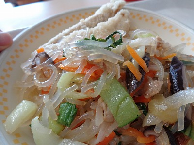 甘辛い味つけで、野菜がたっぷり入っています。春雨はさつまいもから作られた韓国春雨を使っているため、食べごたえがあり、食感が特徴的でした。