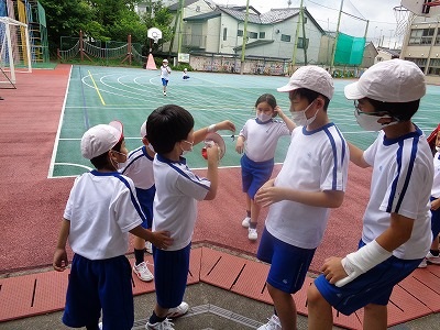 昼休みの始まりです。運動場に出てきた1年生が興味津々!