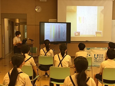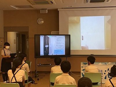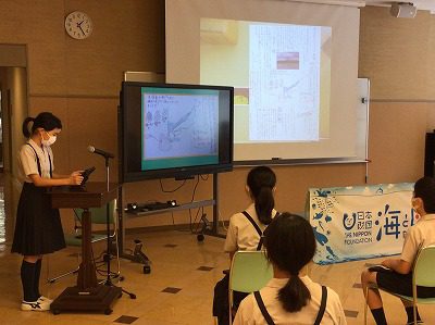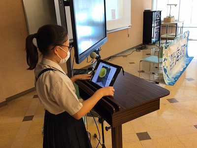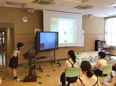 タブレットの操作は“お手のもの”のメンバーです。調査船「平安丸」の上で調査した「海水の塩分濃度」「水質調べ」「水温調査」などの結果や様子を“アップ”にして分かりやすく伝えています。また、海洋センターで知り得た資料をグラフにしたり、養殖場で放流した鯛の稚魚の様子など、私たちの活動を思い出させてくれる場面もありました。