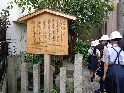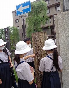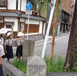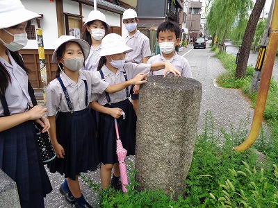 前回(1学期末)は、並河靖之七宝記念館を訪問しました。1889年のパリ万博で金賞を受賞するなど、並河靖之氏の作品を直に鑑賞した子ども達。記念館の塀のある通路を通って三条通りへ。