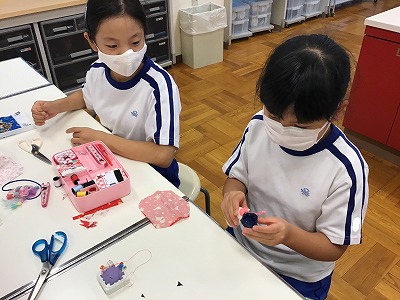 手芸用ボンドでキャップに布をはったり、手縫いした布に綿をつめて作りました。