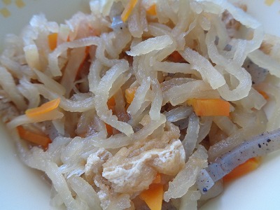 切り干し大根の煮物です。水分を多く含む大根は、乾燥させて切り干し大根にすることで、栄養やうま味がぐっと凝縮されます。食物繊維はお腹の中をきれいにしてくれたり、ビタミンB1は体の疲労を回復させる働きをしてくれます。