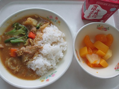 体をつくる食べ物は、豚肉のほかにも細かく砕いた大豆を混ぜています。ブロッコリーや三度豆など緑色のきれいな野菜や、人参、じゃがいもなどたくさんの野菜を使って作ります。様々な食べ物が入ったカレーでおいしく仕上がりました。