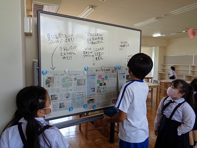 In front of the school’s office and 2nd floor gallery, there are white boards displaying pages from the Asa-sho newspaper for elementary school students. Children of Event, Game committee have written comments and summaries on the board.