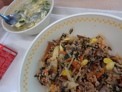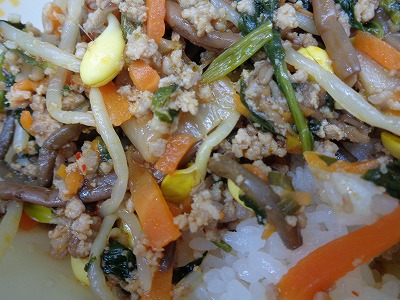 青菜のほうれん草や人参が色鮮やかです。特に豆もやしの黄色は特徴的で、豆の部分は歯ごたえがあって、おいしいです。具とご飯をよく混ぜて、おいしくいただきました。