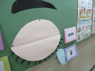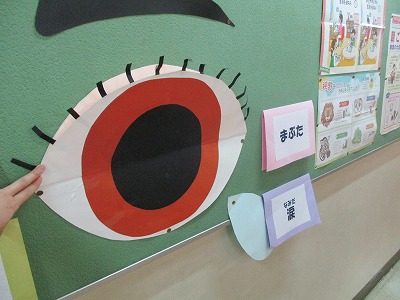 10月10日は目の愛護デーということを先週も紹介しましたが、保健室前の掲示物も、10月は大きな「目」です。