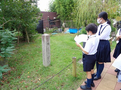 行くすがら、八角の基壇があり、みんなで内角の和を確認したり、その角度が135度であることを計算しました。さすが高学年! 算数問題をなんなく解いていました!
