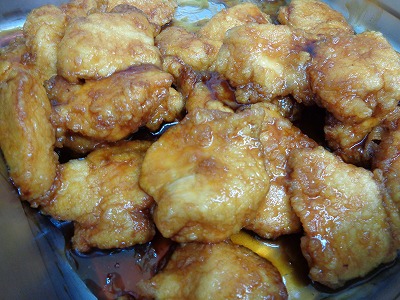 ☆ 治部煮は、下味をつけた鶏肉に片栗粉をつけて揚げた後、とろみのあるたれにつけてあります。