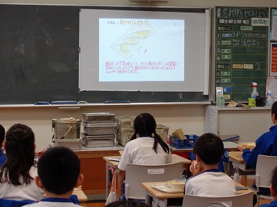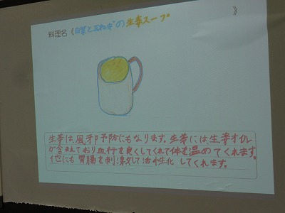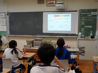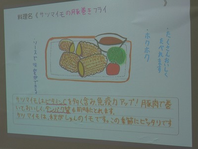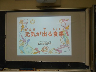 給食の時間、食生活委員会は「元気が出る食事」について発表しました。