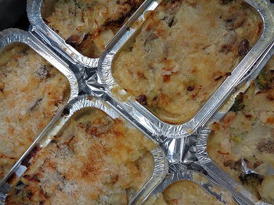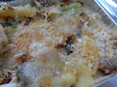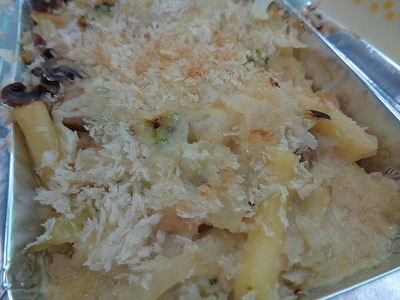 牛乳を使うよりも、あっさりとした仕上がりになるのが特徴です。中の具はじゃがいも、マカロニ、玉ねぎ、ブロッコリー、マッシュルーム、ツナです。味噌を使って味つけしたのも、今日のグラタンのポイントです。