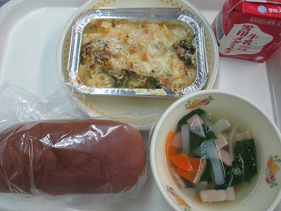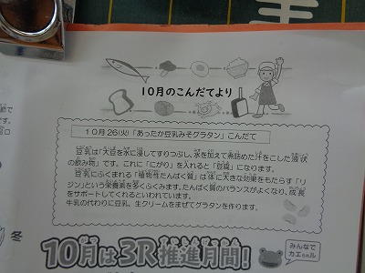 ところで、スクールランチ10月号をご覧ください。今回の「あったか豆乳みそグラタン」と栄養素などを記したコーナーがあります。
