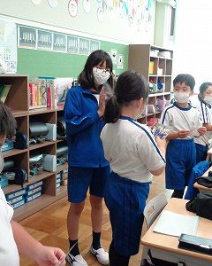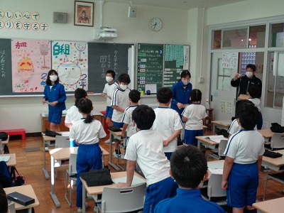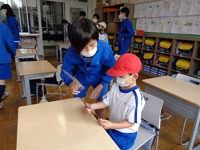 6年生はやさしく一言、声をかけます。「遠足、楽しかったね!」「また遊ぼうね。」