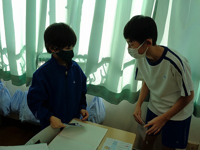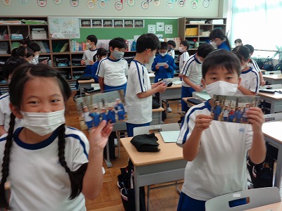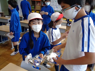 先週の全校遠足で、各れんげ班毎に記念写真を撮っていました。昨日、写真屋さんが届けてくれましたので、今朝、6年生が班のメンバー全員に「思い出写真」を手渡しに行きました。