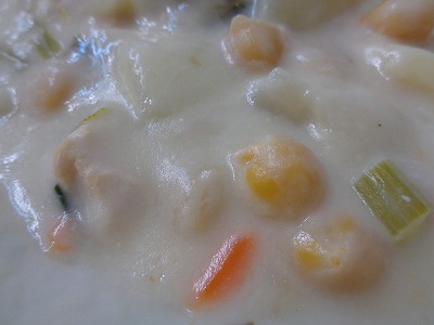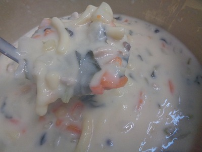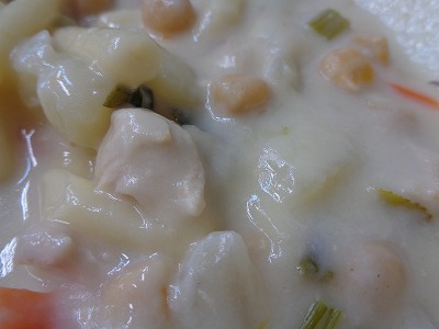 しめじや小松菜、人参、玉ねぎなどの野菜のほかに、じゃがいもやひよこ豆、マカロニが入って食べごたえがあります。