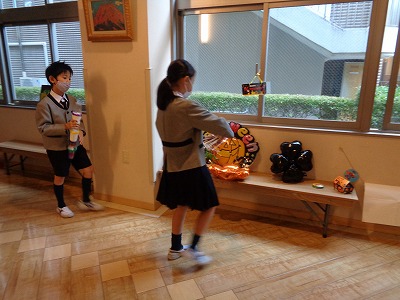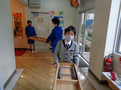 ハロウィン掲示を片付けの様子です。丁寧に英語絵本のほこりを取ったり、長椅子を元の場所に戻しました。