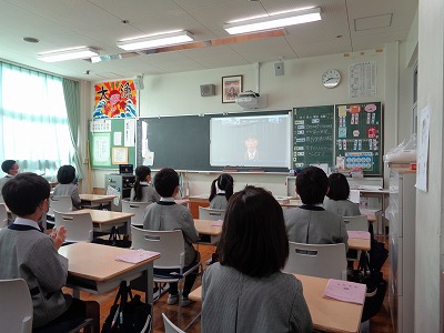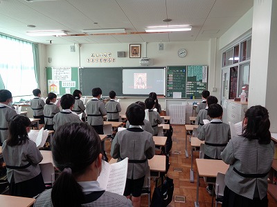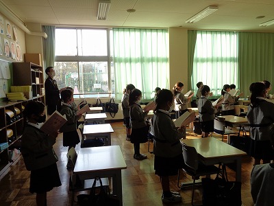 教室では、子ども達が身の回りの整理整頓を終えて自分の席に着き、読書をしたり、自分の課題に取り組んだりして、放送礼拝までの時間を静かに過ごしています。