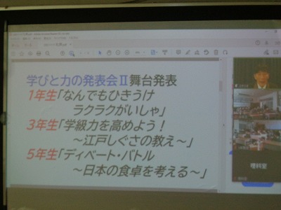 さて、舞台発表が近づいています。校長先生より1,3,5年生の発表タイトルと、その内容と学習の背景について紹介がありました。