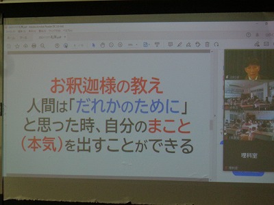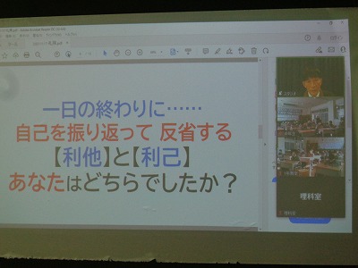 一人ひとりがその日一日、自分が「利他」(周囲の人を考えた行動)であったか「利己」(自分中心的な行動)であったかを振り返ることのお話がありました。