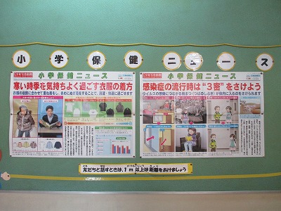 今回、「寒くなったときに気をつけること」をテーマに、保健室前の小学保健ニュースの掲示を替えました。