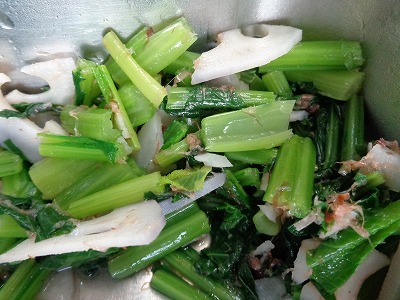 ☆ 和え物は、あらかじめ炊いた、れんこんと茹でて火を通した小松菜を合わせて調理しました。