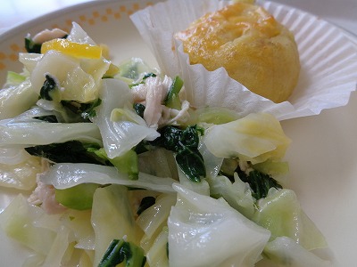 ☆ チンゲン菜、パプリカ、キャベツ、鶏のささみ肉を合わせた和え物です。