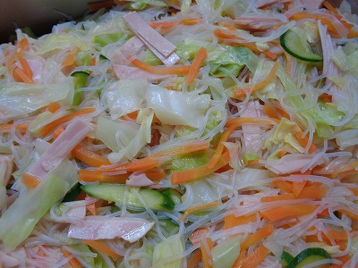 キャベツや人参が春雨の細さとなじむように、細目の短冊切りや千切りにして、切り方を工夫しています。