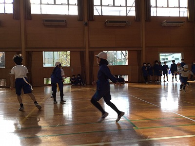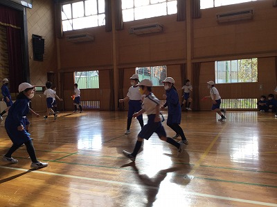 色鉢巻きを“しっぽ”に見立て、異学年の交流の鬼ごっこが実りました。