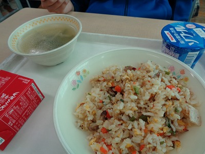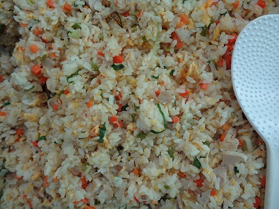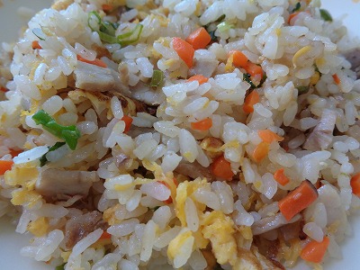☆ 五目チャーハンは焼き豚、ピーマン、人参、ねぎ、卵が入っています。まず卵を炒めて、チャーハンを作ります。