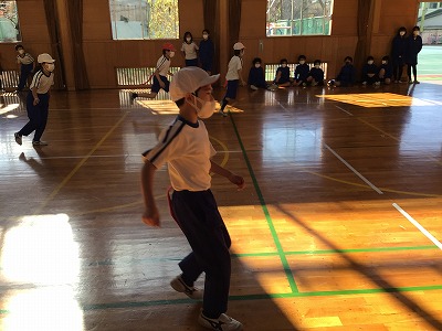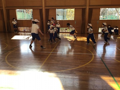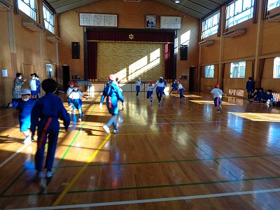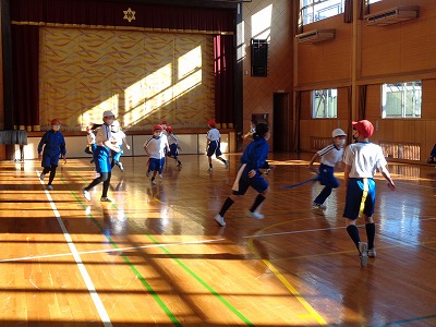 始まりました。自分の“しっぽ”を取られないように、また、別の色の“しっぽ”をねらって、体育館を走り回ります。