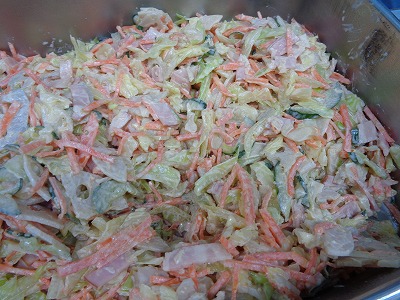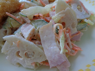☆ れんこんがメインのサラダは、ごまとマヨネーズを使って味つけしました。