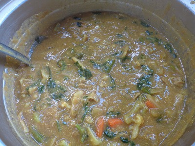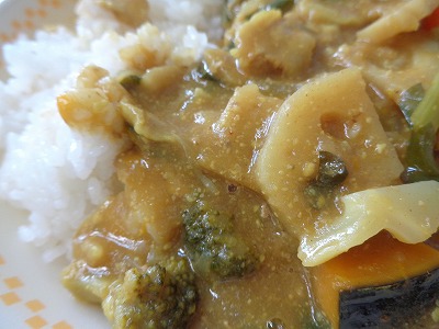 小松菜の緑色やれんこん、カリフラワーの白色で、いつものカレーとは違う色合いになりました。