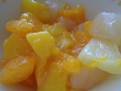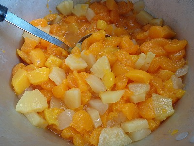 ☆ フルーツカクテルは、缶詰の黄桃やパイナップルを混ぜたデザートです。