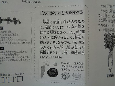 * ところで、12月22日(水)は冬至です。スクールランチのお便りに、日本の食文化の一つとして冬至に「ん」のつく食べると「運」に通じるとして縁起がよいとの記載があります。