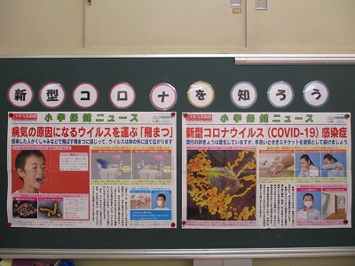 保健室には、新型コロナについてや、感染するときに気をつけなければいけない「ひまつ」のことなど、コロナについての掲示をしています。