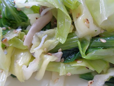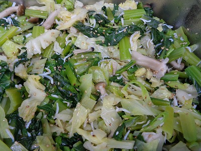 ☆ 小松菜、キャベツ、しめじを合わせたじゃこ炒めです。